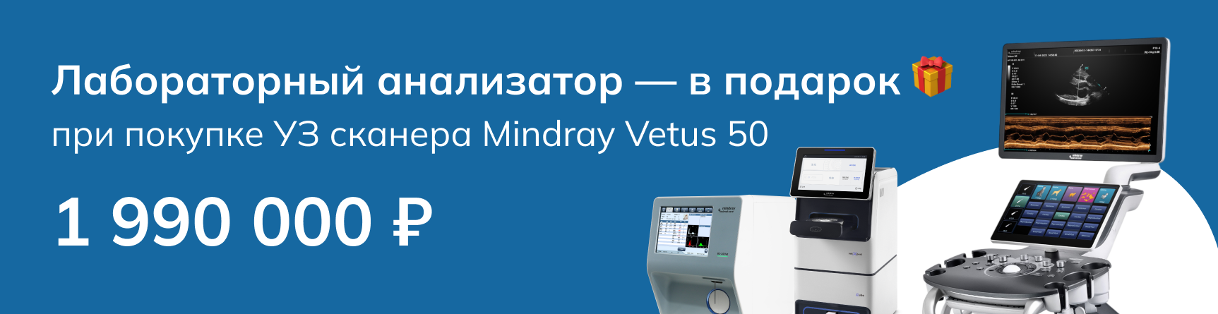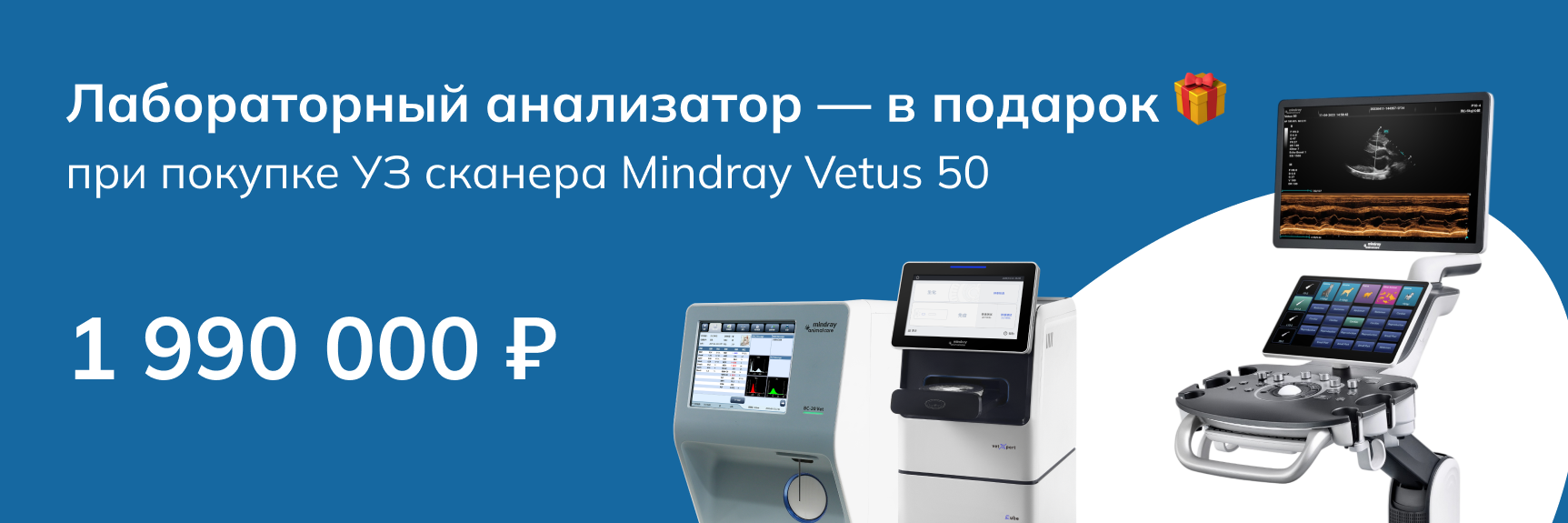 При покупке ультразвукового сканера Mindray Vetus 50 за 1 990 000 руб. (при 100% предоплате), вы бесплатно получите лабораторный анализатор на выбор: